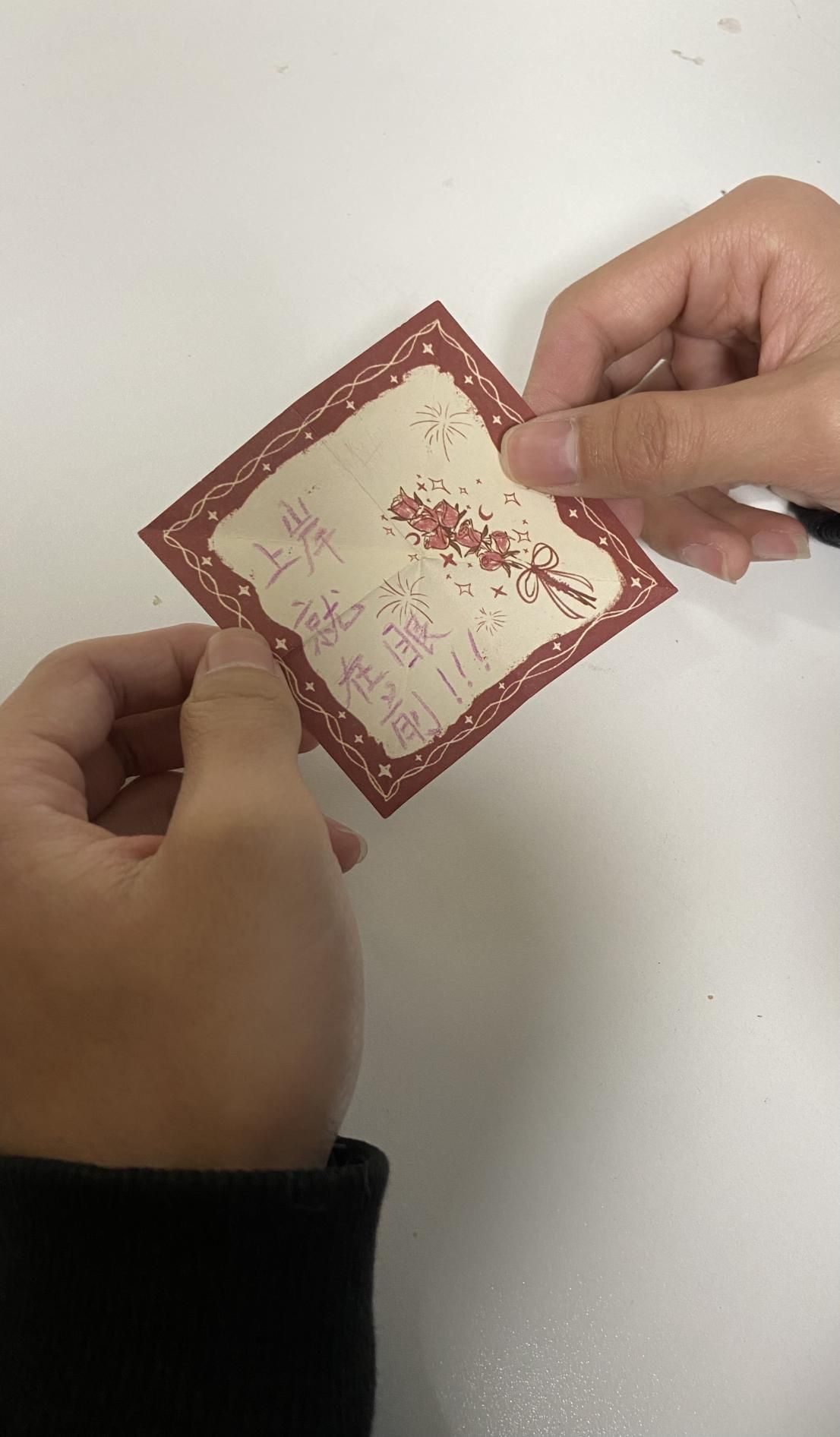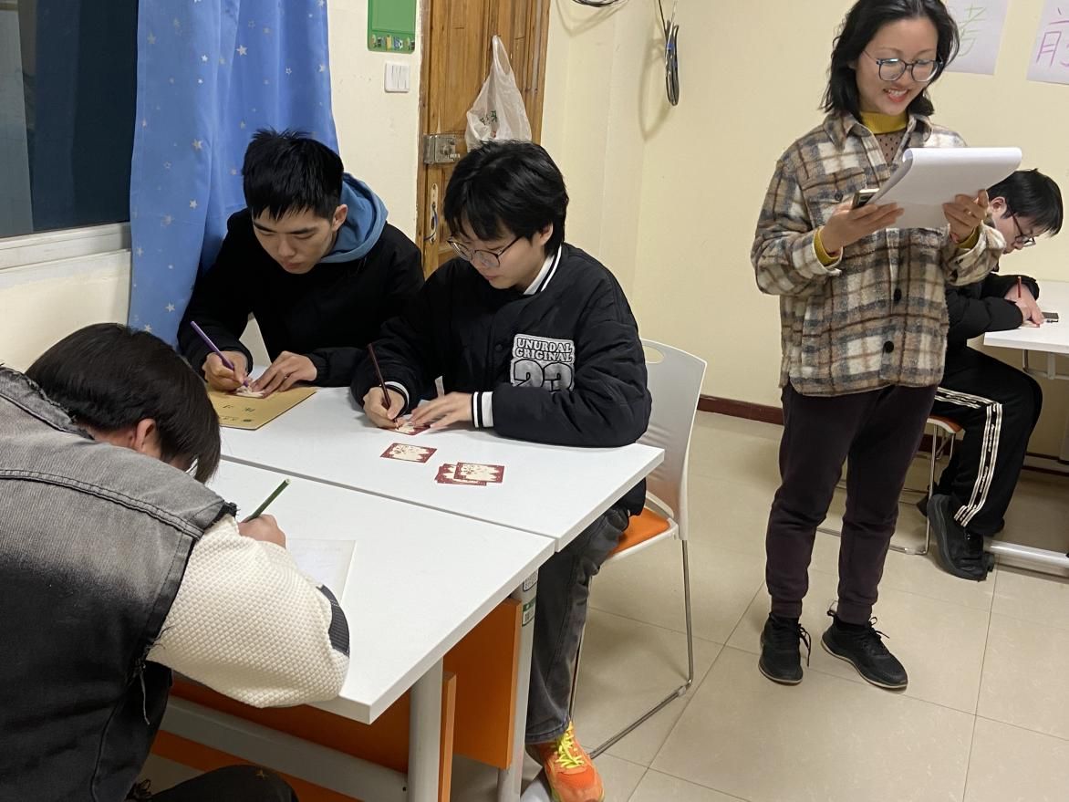 在”寄语传情”互助环节,辅导员要求同学们书写励志话语互赠祝福。同学们选择喜爱的颜色铅笔,拿到纸片,将“美梦成真”“上岸就在眼前”等暖心话语写上,并通过“手写抽盲盒”趣味游戏,收获祝福卡片。