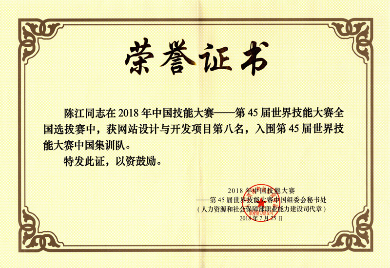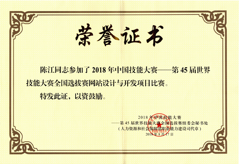 第45届世界技能大赛湖北选拔赛网站设计与开发项目于2018年1月20日开始,在二天的比赛中,选手完成单页制作、响应式布局、JS游戏交互、PHP网站开发4个模块,每个模块3个小时。德赢Vwin官方区域合作伙伴2016级陈江同学获得一等奖,同时进入湖北省集训队,集训队由比赛前十名选手组成。