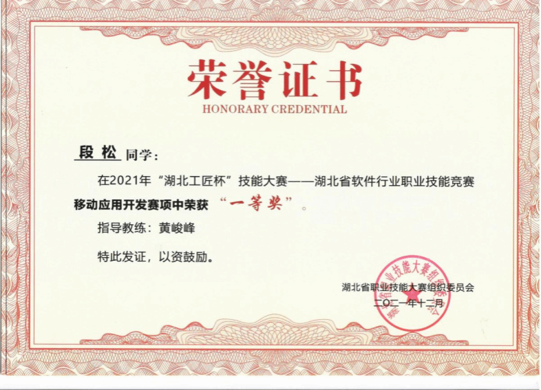 学生参加湖北省“工匠杯”职业技能大赛,2021年在《移动应用开发》赛项中获一等奖,2023年在《网站设计与开发》、《农业数字化解决方案设计师》赛项中均获得一等奖。