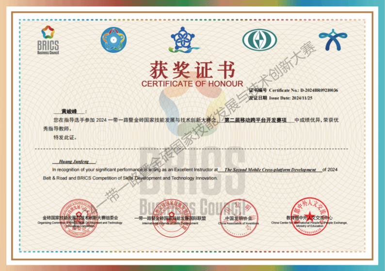 2024年指导学生在金砖国家技能大赛全国决赛《WEB技术》和《移动应用开发赛项》中获得二等奖。