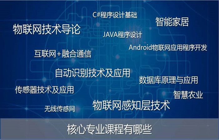 物联网概论、Java面向对象程序设计、传感器应用技术、自动识别技术、单片机技术、无线组网技术、嵌入式技术、Android应用技术、Web应用技术、MySQL数据库技术应用、物联网设备装调与维护、物联网项目规划与实施、物联网系统部署与运维。